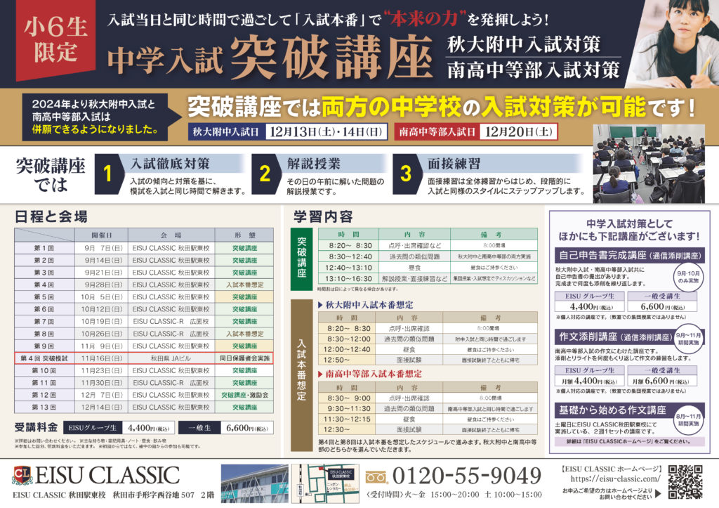 このような多岐に渡る対策をサポートするために、EISU CLASSIC秋田駅東校では9月より中学入試の総合対策として「突破講座」で受検生を応援しております。